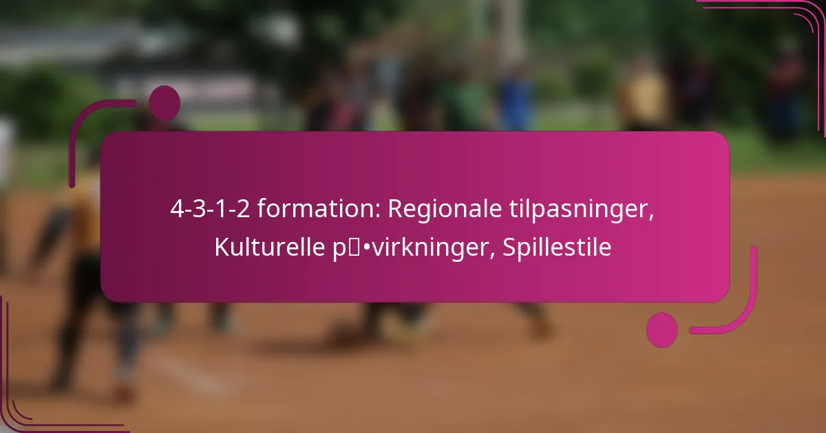 4-3-1-2 formationen er en taktisk opstilling i fodbold, der består af fire forsvarsspillere, tre midtbanespillere, en offensiv midtbanespiller og to angribere, hvilket understreger en stærk tilstedeværelse på midtbanen. Denne formation er regionalt tilpasset for at afspejle forskellige taktiske filosofier og kulturelle påvirkninger, hvilket resulterer i forskellige tilgange på tværs af kontinenter. Ved at undersøge disse tilpasninger kan man få indsigt i, hvordan hold skræddersyr deres strategier for at tilpasse sig lokale spillestile og historiske kontekster.